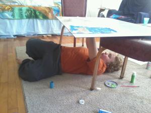 As part of our “cathedral” section of our current middle ages unit studies, we researched Michelangelo and his masterpiece ceiling of the Sistine Chapel. To get a feel of what laying on your back and painting was like, we taped some paper to our dry erase board and and set it across a couple of chairs, then took turns laying under it to paint Bible story scenes. Even the homeschool graduate wanted in on this project. I love it when our assignments capture the interest of the older kids.